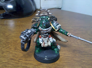 The sternguards and robed veteran are pretty straight forward.  I used more metallic colors to accent their weapons and armor, and add an element of individuality.  For the captain I decided to try a combination of fancy and battle damaged.  His armor and robes are scarred and burned, but you can tell he started out looking shiny and impressive.  He is a bad motherfucker, and he's not afraid to wade through ankle deep blood and gore to take care of his business.